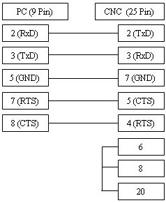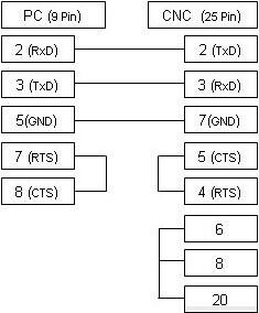 Cable shown here is most common supporting xOn/xOff (DC1/DC3) flow control. If your CNC is configured to use RTS/CTS (Hardware) flow control then see the alternative cable diagram here.