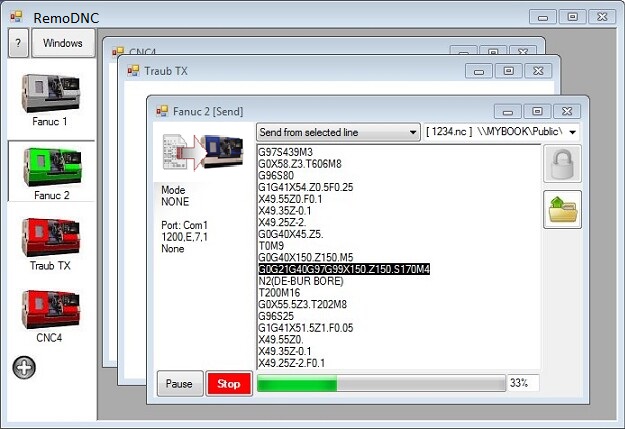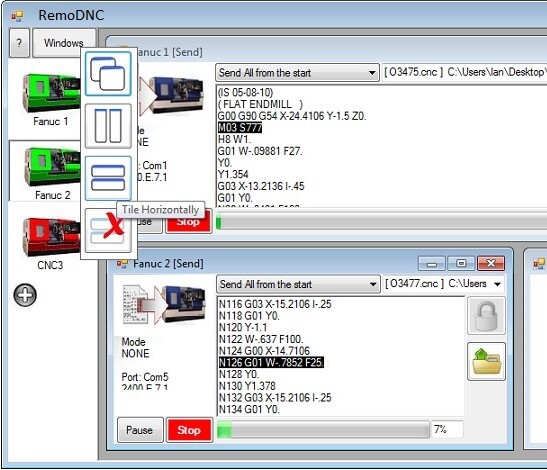 Drag and size the windows any way you want. Here we're sending to two CNC machines at the same time. In the example below we selected the option to "Tile Horizontally" and easyDnc sizes and arranges the windows automatically giving us a clear view of both DNC processes.