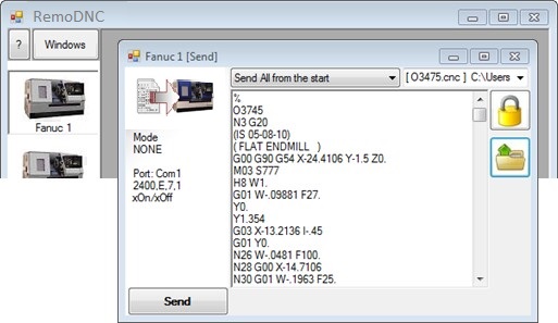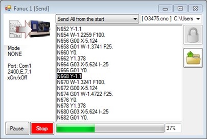 When you hit the [Send] button the data starts feeding into the CNC and you can see the progress as data scrolls up through the buffer window and the progress bar moves left to right.